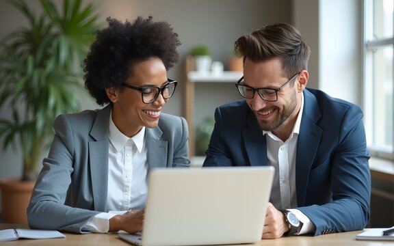 Team of diverse partners mature Latin business man and European business woman discussing project on laptop sitting at table in office. Two colleagues of professional business people working together.