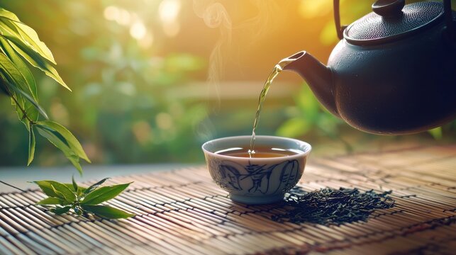 A close-up of a teapot pouring tea into a porcelain cup, with fresh tea leaves on a bamboo mat, and the serene ambiance of a traditional Japanese tea ceremony in the background