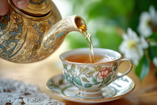 Unrecognizable woman pouring tea from ceramic teapot into cup while sitting at table with another Caucasian middle aged woman, hands and partial faces visible, sharing moment