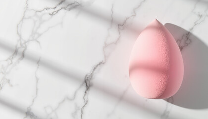 Vibrant orange makeup sponge in teardrop shape placed on peach background, ideal for cosmetic application and blending