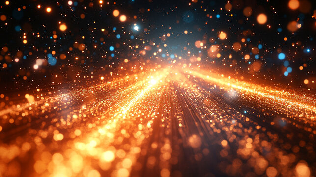 Abstract digital roadmap visualization. Dynamic flow of data points with glowing orange, turquoise trails. Futuristic, modern tech concept for business process modernization. Illustrates seamless