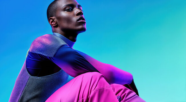 Futuristic portrait of a fit, black man in bold, high-tech activewear, illuminated by vibrant neon lighting. Athletic, tech fashionable background.