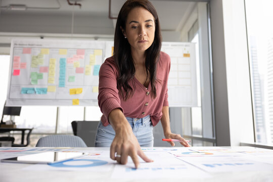 Young concentrated indian SEO specialist looking over advertising conversion