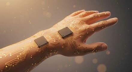 Person with advanced technology interface on arm, holding a mug, blending humanity with tech for a futuristic cybernetic integration concept.