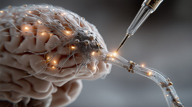 A flexible, mesh-like neural lace implant connecting to individual neurons on the surface of the brain.