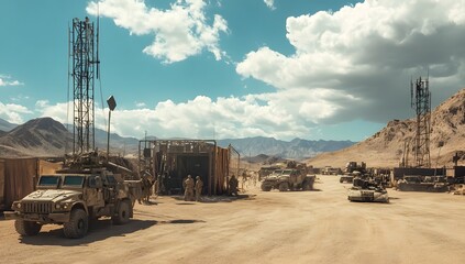 Military vehicles in desert base camp under clear sky