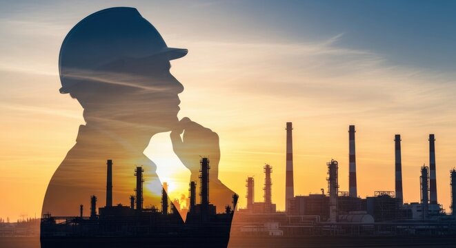 Thoughtful engineer reflecting on industrial growth during sunset in an urban landscape