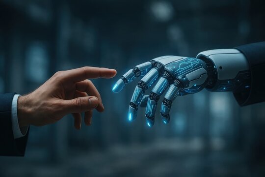 Human and robotic hands reaching out, symbolizing technology's impact on jobs amid global economic crisis.