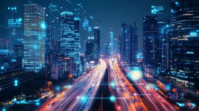 Nighttime city with futuristic data analytics overlay