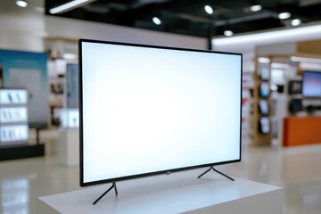 A blank smart TV screen on a vertical stand in a brightly lit tech store showroom, ready for a display demo.