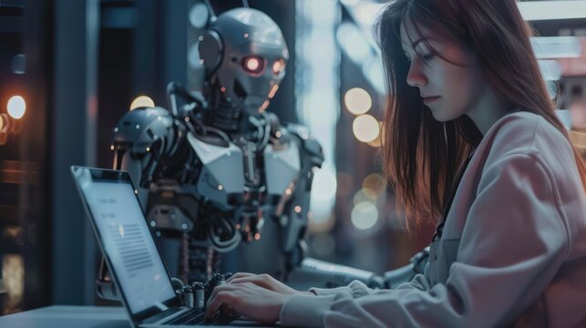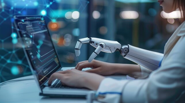 In a modern setting, a young woman is seen working on a laptop with a digital interface and network overlay AIG62