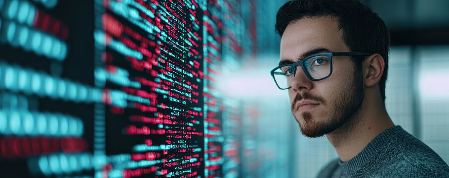 Innovative AI developer focused on coding with futuristic digital overlays. intense atmosphere highlights blend of technology and creativity