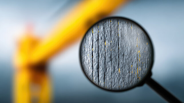 Magnifying glass focusing textured wood surface with yellow paint spots symbolizing digital literacy and intelligence driving future innovation