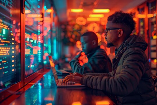 Two young tech enthusiasts are immersed in coding on their laptops in a cyber cafe bathed in the neon blue glow of data screens.