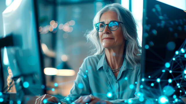 Senior woman with glasses working on computer, surrounded by digital network elements, symbolizing integration of older generations with advanced technology in professional setting.