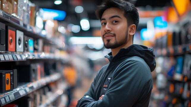 Man tapping smart jacket sleeve touchscreen interface wearable tech control futuristic lab