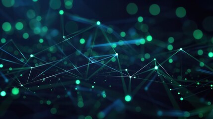 Deep navy background with emerald green dots connected by neon blue glowing lines, upper center text focus