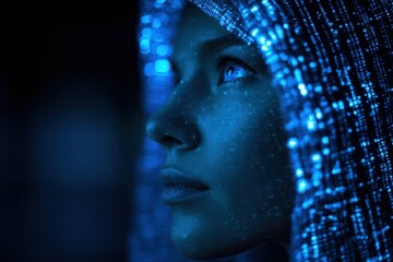 Lifting athlete holding barbell overhead with blue binary overlay for tech-driven training