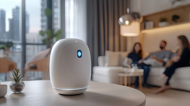 Smart speaker integrates technology into living spaces, creating a lively atmosphere as friends engage in conversation