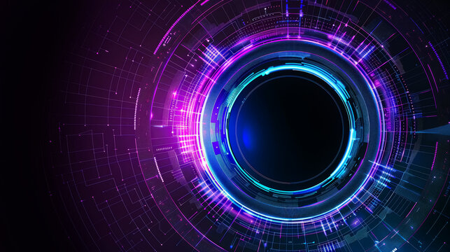 Digital blue and purple tech circle on dark background. Science, futuristic digital technologies concept.