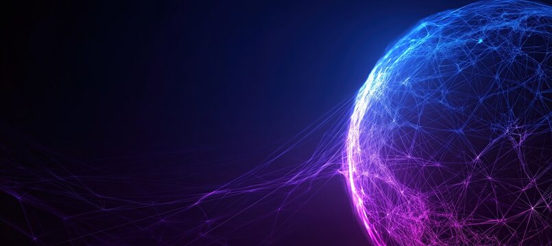 A vibrant digital representation of interconnected lines forming a globe, showcasing a blend of blue and purple hues against a dark background.