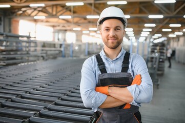 Asian male engineer in uniform inspection warehouse and check control heavy machine construction installation in industrial factory. technician worker check for repair maintenance operation system