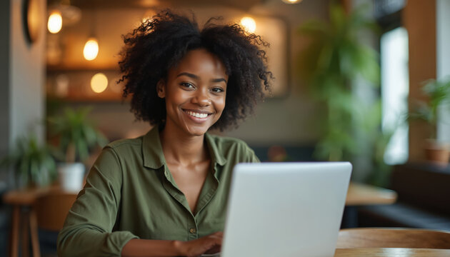 Young Black woman smiles at camera while typing on a laptop in a cafe. She works remotely, enjoys a casual lifestyle and uses tech for freelance projects or studies.