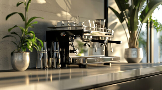 A minimalist espresso machine sits in the center of the cafes counter with sleek black and chrome finishes and a few potted plants adding a touch of greenery.