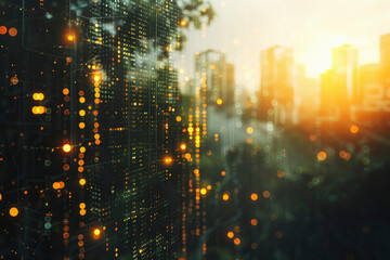 Revealing multicolor digital matrix of glowing dots and vertical bands on dark grid