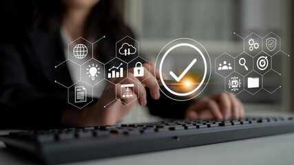 Close-up of hand engaging with digital interface featuring checkmarks and icons, symbolizing progress and success in a contemporary tech setting