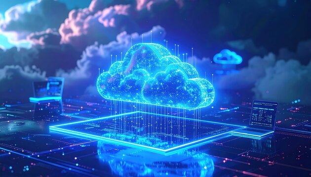 A digital representation of a cloud computing concept, featuring glowing cloud elements and data visualization in a futuristic setting.