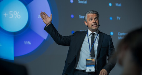 Successful Caucasian Businessman Giving Presentation At International Business Forum. Male Entrepreneur Pitching An Innovative Online Software Solution Startup To Diverse Audience Of Investors.