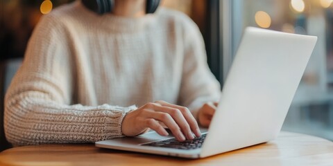 Person typing on a laptop in a cozy cafe setting, warm light creating a comfortable atmosphere.