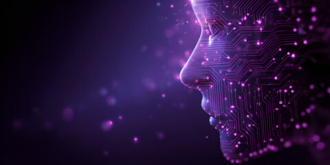 Futuristic female face with glowing purple circuits and digital sparkles on dark background