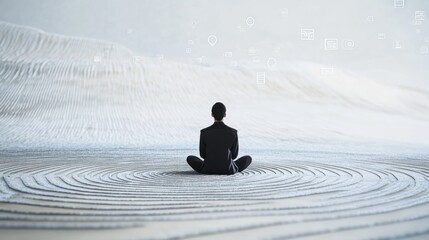 A serene image of a person sitting in a Zen garden with sand patterns made of digital code and floating icons, symbolizing the pursuit of calm and mindfulness amidst a tech-driven world