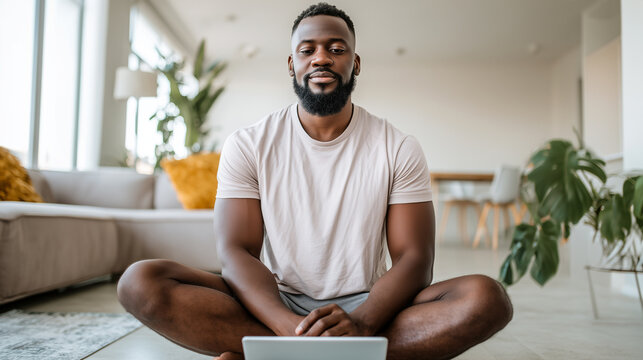 African american man practicing mindfulness at home with smartwatch