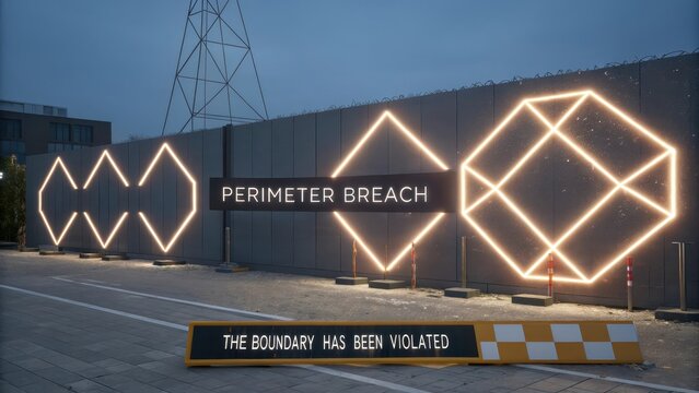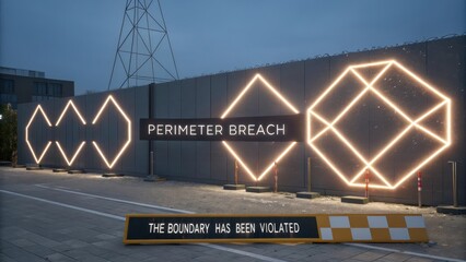 Perimeter Breach Warning Sign with Glowing Geometric Patterns on a Security Wall