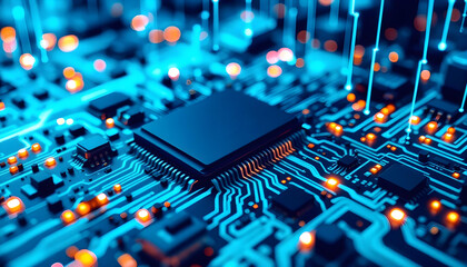 Abstract digital network circuit board background banner with glowing light and connecting data dots in blue and black colors. Big data technology concept.