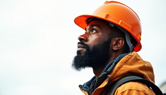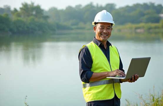 Environmental engineer smiles holding laptop near body of water. Man wears hard hat and safety vest, inspects water quality outdoors. Tech pro works on eco project by river.