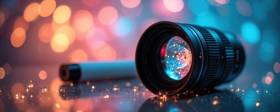 Close-up shot shows camera lens with reflection of bokeh lights. Focus is on detail and optic precision. Pro photo tech or equipment concept for advertisement or creative projects.