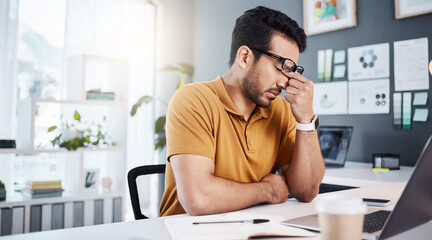 Headache, office burnout and man with mistake, pain or stress from software system error. Mental health, 404 laptop glitch and business person with depression, emergency or tension problem