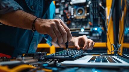 Technician providing technical assistance and repairing laptop computers.