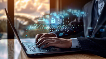 person's hands typing on a laptop with a digital overlay of a secure cloud network graphic, implying a focus on cybersecurity or data protection.