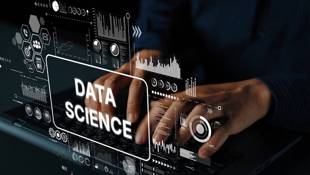 Hands Typing on Laptop with Graphic Overlays Representing Data Science Concepts and Visualizations in Modern Workspace. Asymptotic smart data analytic.