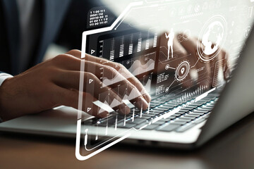 Close-up of a person's hands typing on a laptop keyboard, with overlaid digital graphics representing data and analytics, business and technology.
