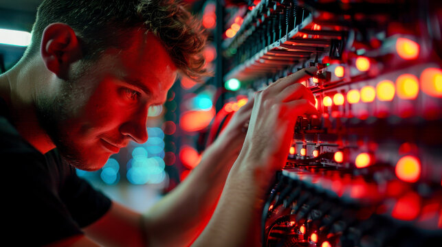 Setting up network firewall, focused IT professional works diligently amidst glowing red lights, ensuring security and connectivity in high tech environment