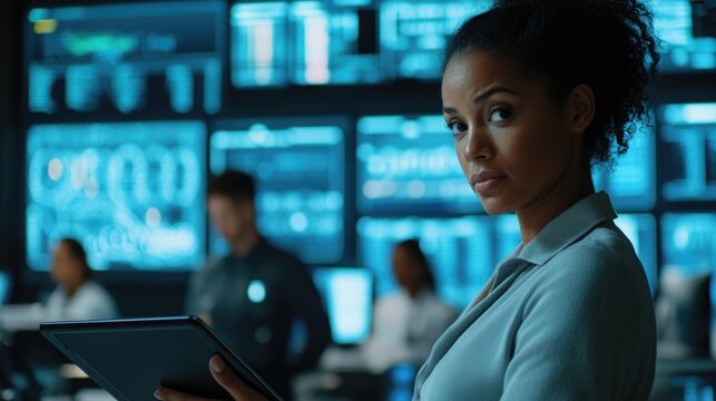 Tech Visionary: A skilled specialist stands confidently in a futuristic server room, using a tablet, her sharp gaze hinting at the cutting-edge technology she masterfully oversees.
