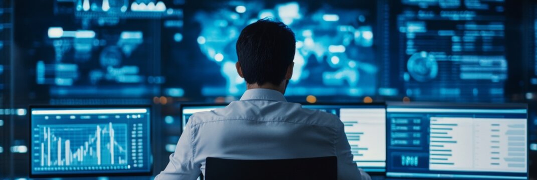 Data center server control. System security specialist with multiple displays, man working in data information protection and cyber security in monitoring room