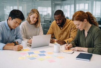 Group of diverse professionals brainstorming and collaborating on a project using sticky notes in a modern office setting