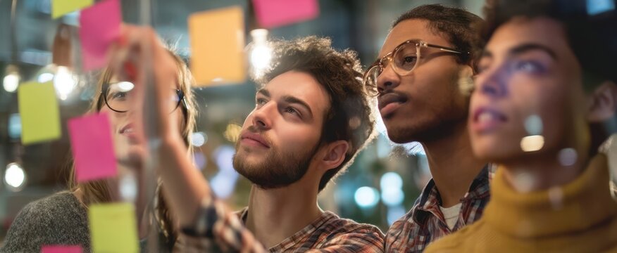 Group of young professionals collaborating during brainstorming session, using colorful sticky notes on glass wall in modern office.